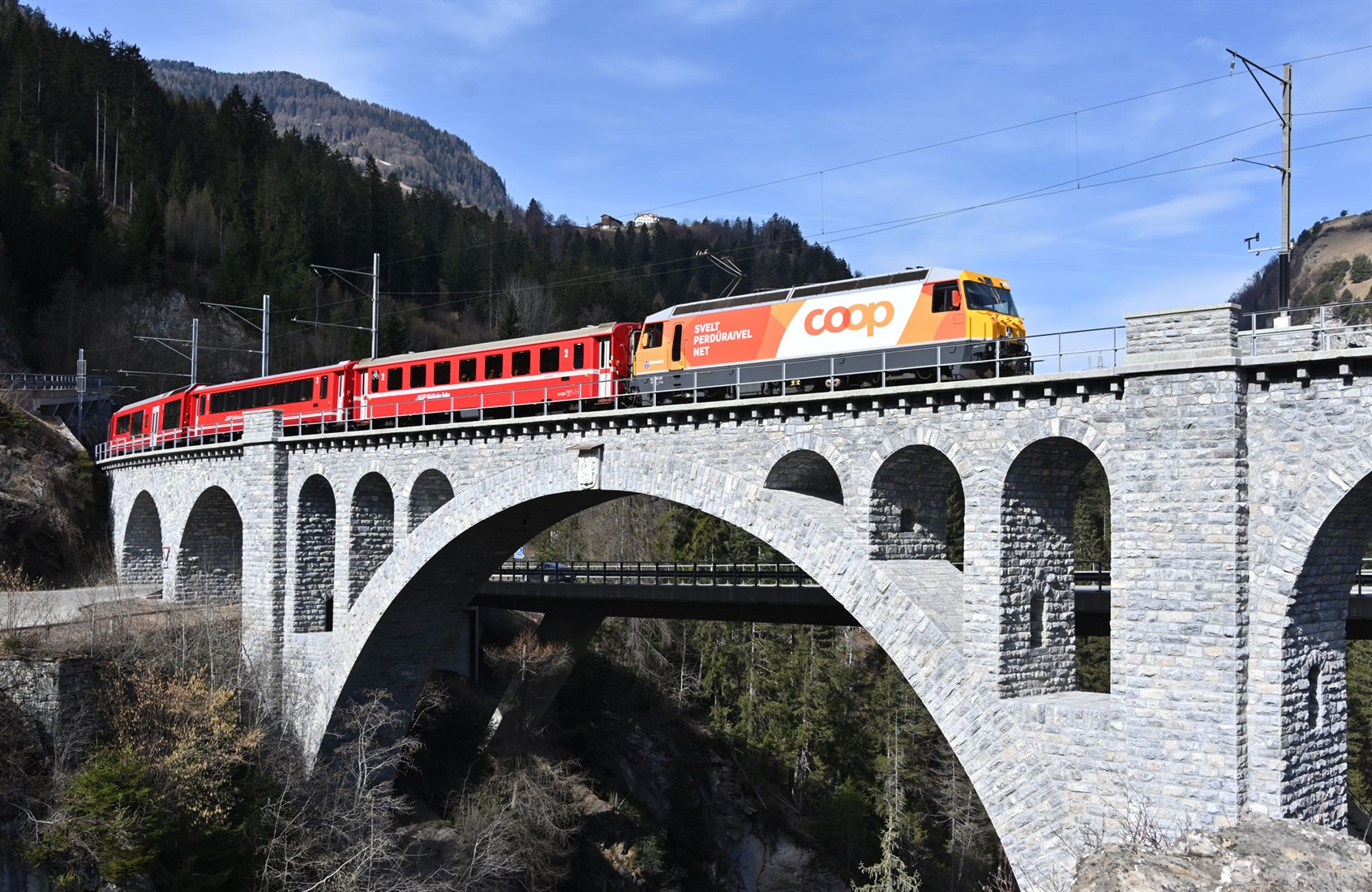 Die Coop Genossenschaft hat die Lokwerbung der seit 1999 für eines der größten Detailhandels- und Großhandelsunternehmen in der Schweiz werbenden Ge 4/4 III 641 zum vierten Mal angepasst: sie wurde kurz vor Ostern im Stile der bereits auf Schweizer Normalspurgleisen verkehrenden Loks des Typs Stadler Euro 9000 bzw. Siemens Vectron unter Verwendung der drei Logofarben gestaltet. Bereits seit Sommer 2025 trägt der Klimacontainer Y 11629 dieses auffallende Design. Er wurde nach dem Umbau des Schiebewandwagens Haiqq-tyz 5164 auf den daraus entstandenen Tragwagen Sb 65615 geladen.