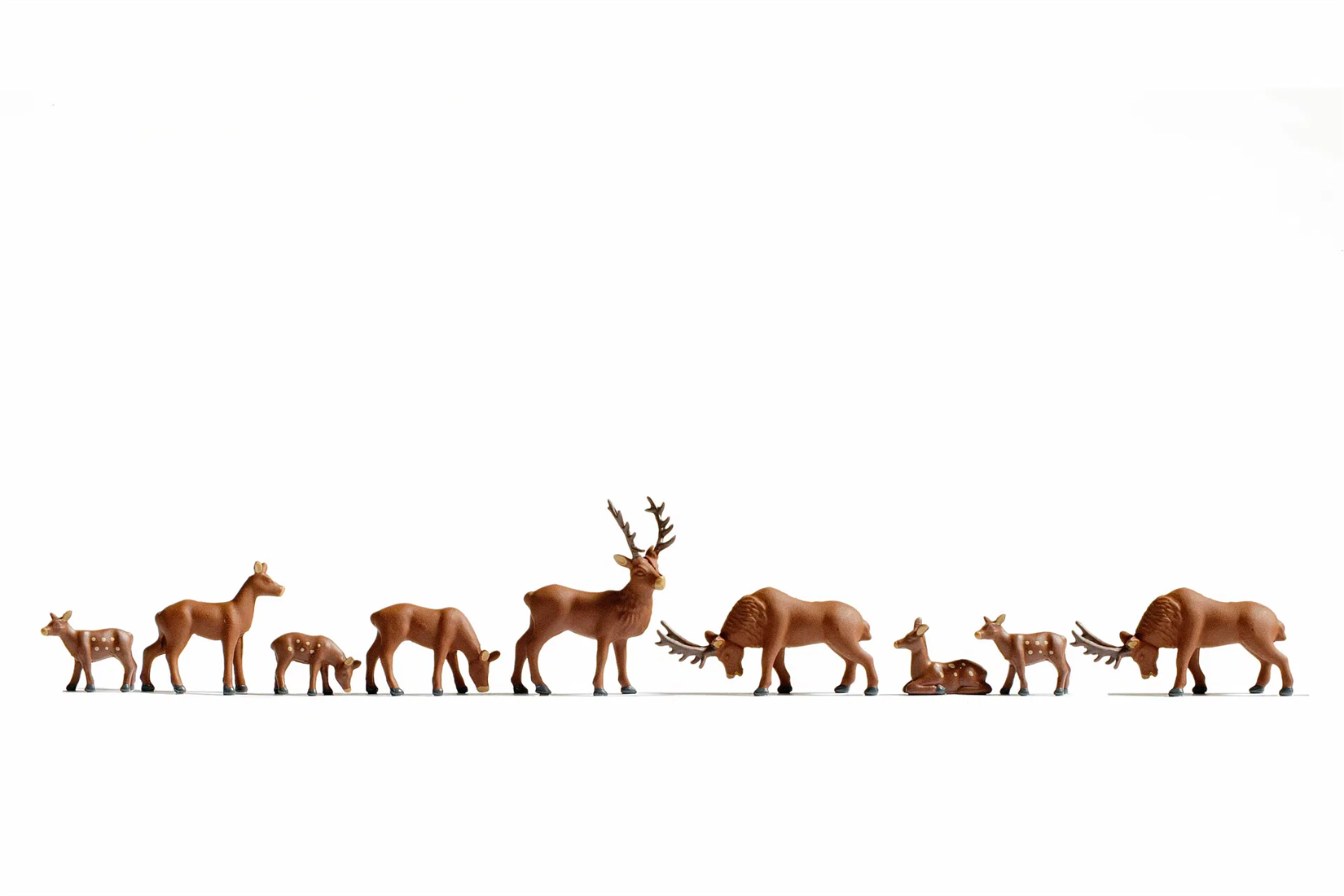 Das Set für die Spur N (Maßstab 1:160, ca. 1,1 cm hoch) umfasst vier erwachsene Hirsche sowie drei Hirschkälber.