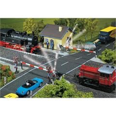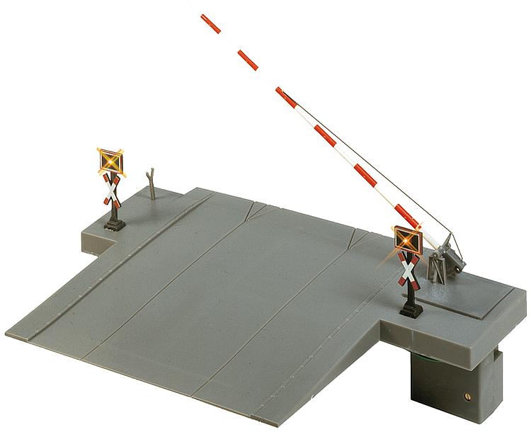 Dieser microprozessor gesteuerte Bahnübergang ist mit 4 blinkenden Andreaskreuzen, 2 durchgehenden Schrankenbäumen und einer Bahnbude ausgerüstet. Ausgelöst wird die Funktion durch einen Sensor, auch digital ansteuerbar. Für alle Gleisarten und in mehrfacher Gleismenge verwendbar. Auch für das car system für Rechts- und Linksverkehr, 1- und 2-spurig, einsetzbar. Stoppstellen müssen zugekauft werden.