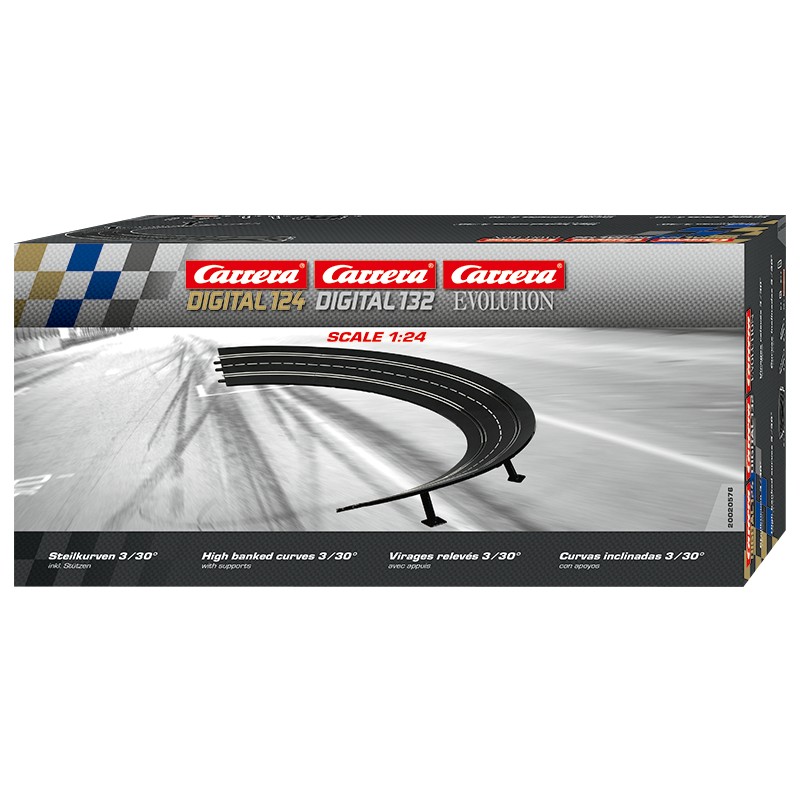Mit dieser Steilkurve verleihst Du Deiner Rennstrecke neuen - im wahrsten Sinne des Wortes - Schwung. Dank der überhöhten Bauweise können die Slotcars die Kurve mit höherer Geschwindigkeit durchfahren, als in einer flachen Kurve. So musst Du in spannenden Rennen nicht so stark abbremsen und kannst den Schwung durch die Kurve hindurch zu dem nächsten Streckenabschnitt mitnehmen. Das Set besteht aus sechs Schienenteilen, die jeweils einen Winkel von 30° aufweisen. Zusammengebaut ergibt das eine langgezogene 180° Kurve, die es für die Rennfahrer zu durchfahren gilt. Die für den Halt der Strecke benötigten Stützen sind in dem Set ebenfalls schon enthalten. Der Streckenabschnitt eignet sich auch für den 6-spurigen Ausbau Deiner Rennstrecke. Die Steilkurve hat einen Maßstab von 1:24 und kann damit an Rennbahnen mit dem gleichen Maßstab angebaut werden: Carrera DIGITAL 124, Carrera DIGITAL 132, Carrera EVOLUTION.