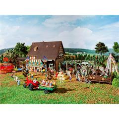 bestehend aus: Bauernhaus mit Hoftor und Scheune, Pergola mit Tischen und Bänken, Weinpresse, Weinfässer, Strohballen mit Beflockung, Reben mit Beflockungsmaterial, Herbstfestschild, Tanzboden mit Erntedankkränzen, Kürbisverkaufsstand mit Kürbissen und rotem Flackerlicht, Sonnenschirm, Waage, eine Figur mit Drachen und vieles mehr.