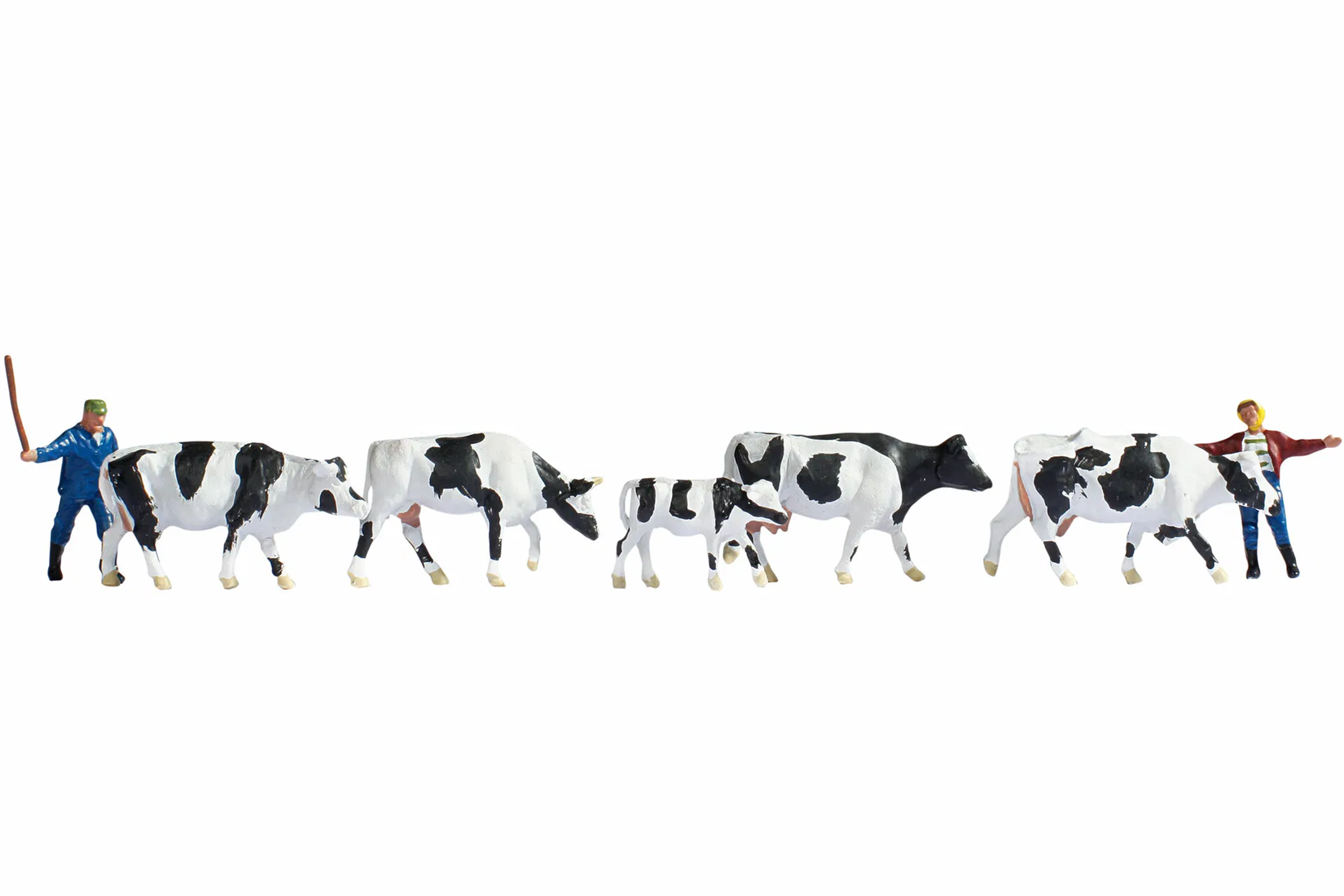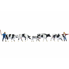 In dem Set für die Spur H0 (Massstab 1:87, ca. 2 cm hoch) sind vier schwarz-weiße Kühe, ein ebenfalls schwarz-weißes Kalb sowie zwei Landwirte enthalten.