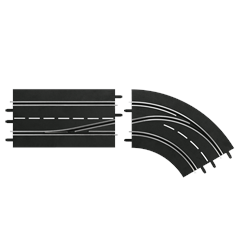 Mit diesem Ausbauset kannst Du für einen Extra-Kick in Deinem Rennen sorgen. Mit der Spurwechselkurve können die Slotcars auf die andere Spur wechseln und ihr Rennen dort fortsetzen. Schaffst Du es Dein Auto dann vor das gegnerische Auto zu setzen, bist Du erstmal im Vorteil, weil er nicht mehr an Dir vorbeikommt. Aber pass auf! Bei einem Spurwechsel kann es auch immer zu einem Crash kommen. Wähle den geeigneten Zeitpunkt und verschaffe Dir so einen Vorteil im Kampf um den Titel. Die Spurwechselkurve besteht aus zwei Schienenteilen und ist für die digitalen Rennbahnen Carrera DIGITAL 124 und Carrera DIGITAL 132 oder die digital nachgerüstete Carrera EVOLUTION im Maßstab 1:24 geeignet.