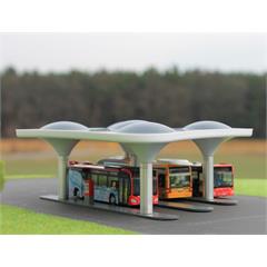 Der Busbahnhof ist in einem modernen Design mit drei Bussteigen gefertigt. Das Modell verfügt über eine blaue indirekte Beleuchtung, sodass die oberen Bögen der Säulen in einem dezenten Licht leuchten. Das Modell wird als Fertigmodell geliefert. Zusätzlich ist ein Gleichrichter für Wechselstromanschluß 14-16V beigelegt. So können Sie die Beleuchtung mit 12V Gleichspannung oder 14-16V Wechselspannung betreiben.