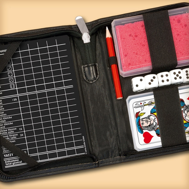 Jasskarten mit französischem Motiv ( Piquet), 5 Würfel, Kreidestift, Schwamm und Jass / Yatzy Tafel. Die Tafel hat auf der einen Seite das Jasser Z/Z und auf der anderen Seite das Yatzy Spiel. Somit werden keine Yatzy Blöcke mehr benötigt. Inkl. Spielanleitung für Yatzy. Alle Materialen in hochwertigem Etui mit Reisverschluss