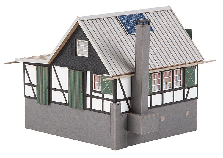 Für den Bau an Hanglagen. Lasercut-Modell einer Fachwerkhütte in Ständerbauweise über einem gemauerten Kellergeschoss nach einem Originalvorbild im Siegerland. Der Grundriss ist in zwei Zonen aufgeteilt, neben dem Wohnteil mit Fensterläden, Außenkamin und kleiner Photovoltaikanlage, gibt es einen ebenfalls beheizbaren Anbau.
