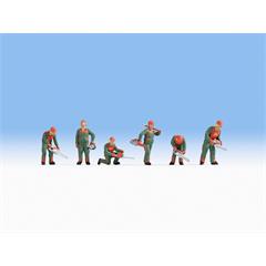 Das Figuren-Set »Waldarbeit« beinhaltet sechs Modellfiguren, die alle im Maßstab 1:87 (Spurweite H0) und handbemalt sind. Alle Waldarbeiter tragen die typische Arbeitskleidung in den Farben grün und orange, die aus einer Jacke und einer langen Hose besteht. Auch der orangefarbene Helm darf nicht fehlen. Dieser dient der eigenen Sicherheit im Wald und schützt vor umstürzenden Bäumen. Alle Figuren haben eine Motorsäge in der Hand und fällen Bäume.