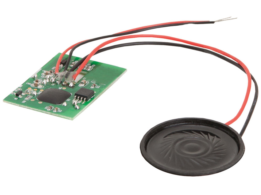 Durch die kompakte Bauweise der Platine mit Lautsprecher kann der Sound zielgenau dort in die Modell-Landschaft eingebaut werden, wo der Sound entstehen soll, z. B. in einem Gebäude.