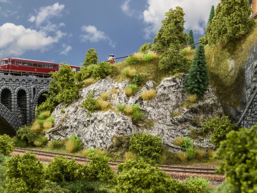 Der Einbau in die Landschaft ist denkbar einfach. Der geknitterte Bogen Fels kann ganz leicht mit den NOCH Landschaftsbau-Kleber in die Landschaft eingeklebt werden. Der Bogen lässt sich dabei leicht über das Gelände biegen.