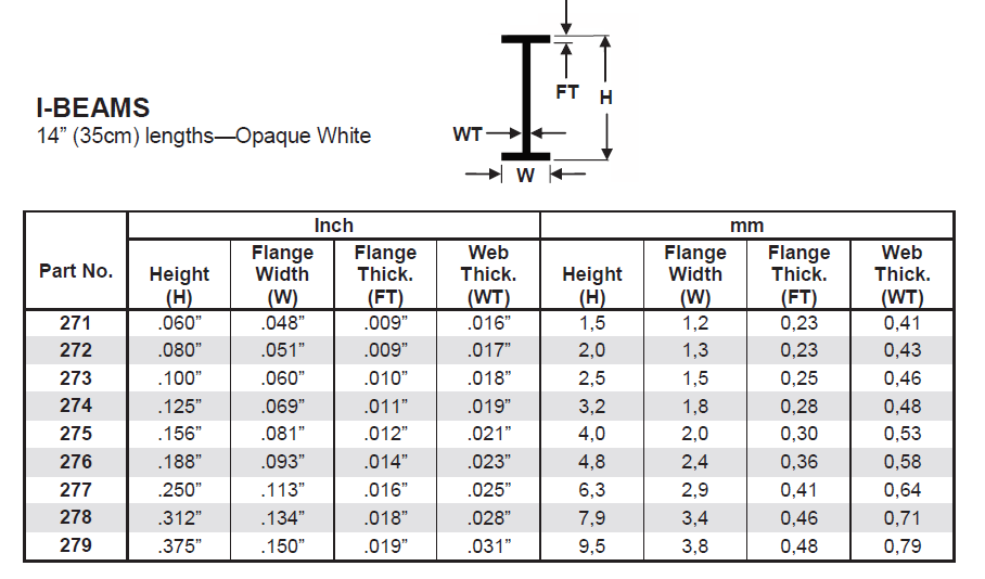 I-Profil aus weißem Polystyrol, 350x6,3X2,9 mm - 1/4, 3 Stück.