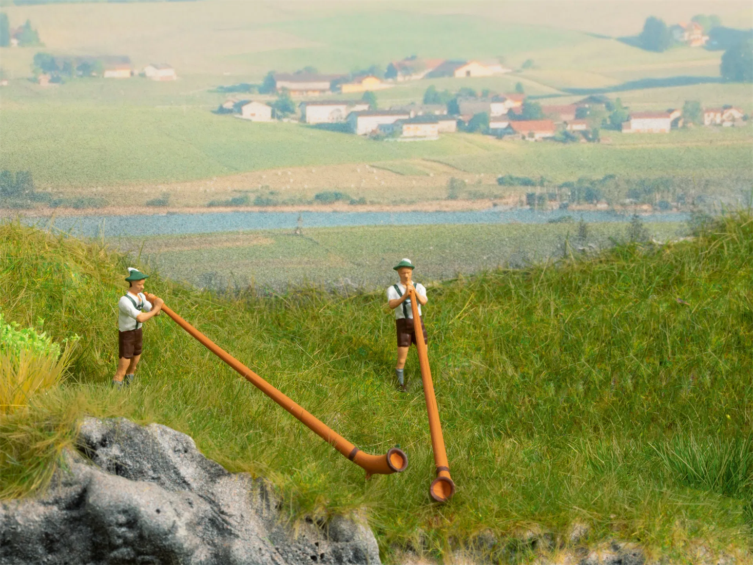Die "Alphornbläser" bringen Leben in Ihre Modelllandschaft! Die Männer tragen traditionelle Kleidung, bestehend aus einer braunen Lederhose mit Hosenträgern, einem weißen Hemd sowie grauen Kniestrümpfen. Zudem haben sie einen grünen Trachtenhut mit einer weißen Feder auf dem Kopf. Ein Mann hat einen langen, schwarzen Bart und der andere einen hellen Schnauzer. Es ertönt das Spielen mehrerer Alphörner.
