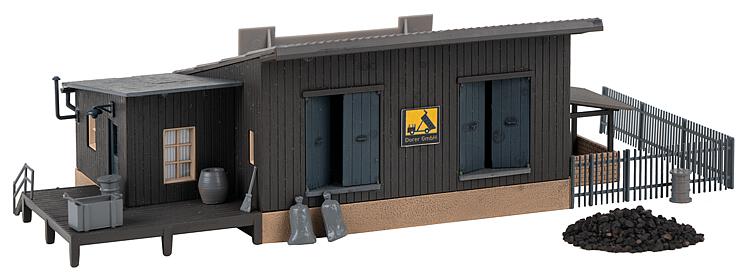 Großer Kohleschuppen in Holzbauweise mit beweglichen Toren zur Bahnseite und einem Pultdach. An den Stirnseiten wird das Lagergebäude flankiert von einem überdachten Außenlager und einem Büroanbau, der über eine kleine Terrasse betreten wird. Für die Szenengestaltung liegen ein Zaun, Schub- und Sackkarren, Fässer, Säcke und Kohle bei.
