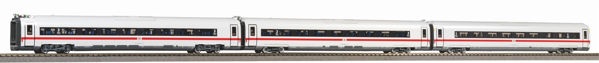 3er Set Ergänzungswagen zum PIKO ICE 4 der DB AG Ep. VI. Die Deutsche Bahn AG beauftragte 2011 Siemens Mobility mit dem Bau von bis zu 300 neuen Hochgeschwindigkeitszügen für den Einsatz in Deutschland, Österreich und der Schweiz. Die neuen Triebzüge der BR 412/812, die gemeinsam von Siemens und Bombardier entwickelt werden, werden über mehrere Wagen, sogenannte Powercars, angetrieben. Die Zugkonfiguration sieht hierbei verschiedene modular aufgebaute Einheiten von fünfteiligen bis zu 14teiligen Zügen vor. Durch dieses Konzept kann der Zug problemlos an die individuellen Vorgaben der Verkehrsunternehmen bei der gewünschten Beschleunigung, Geschwindigkeit und Zahl der Sitzplätze angepasst werden. Die DB hat bisher als Basiskonfiguration85 zwölf- und 45 siebenteilige Triebzüge bestellt, die aus antriebslosen End- bzw. Steuerwagen, angetriebenen Sitzwagen und Bordbistro sowie nichtangetriebenen Sitz-, Speise- und Servicewagen bestehen.Der siebenteilige Triebzug besitzt drei angetriebenen Wagen und bietet 456 Sitzplätze auf einer Länge von 200 Metern. Ein zwölfteiliger Triebzug verfügt über sechs angetriebene Wagen und 830 Sitzplätze auf einer Länge von 346 Metern. Die Höchstgeschwindigkeit beträgt mit 250 km/h. Die äußere Form wurde an die bestehende ICE-Flotte angelehnt und weiterentwickelt. Seit Dezember 2017 werden die ersten Züge im Regelbetrieb auf den Linien Hamburg–Würzburg, Stuttgart–München und Hamburg–Berlin–München eingesetzt.