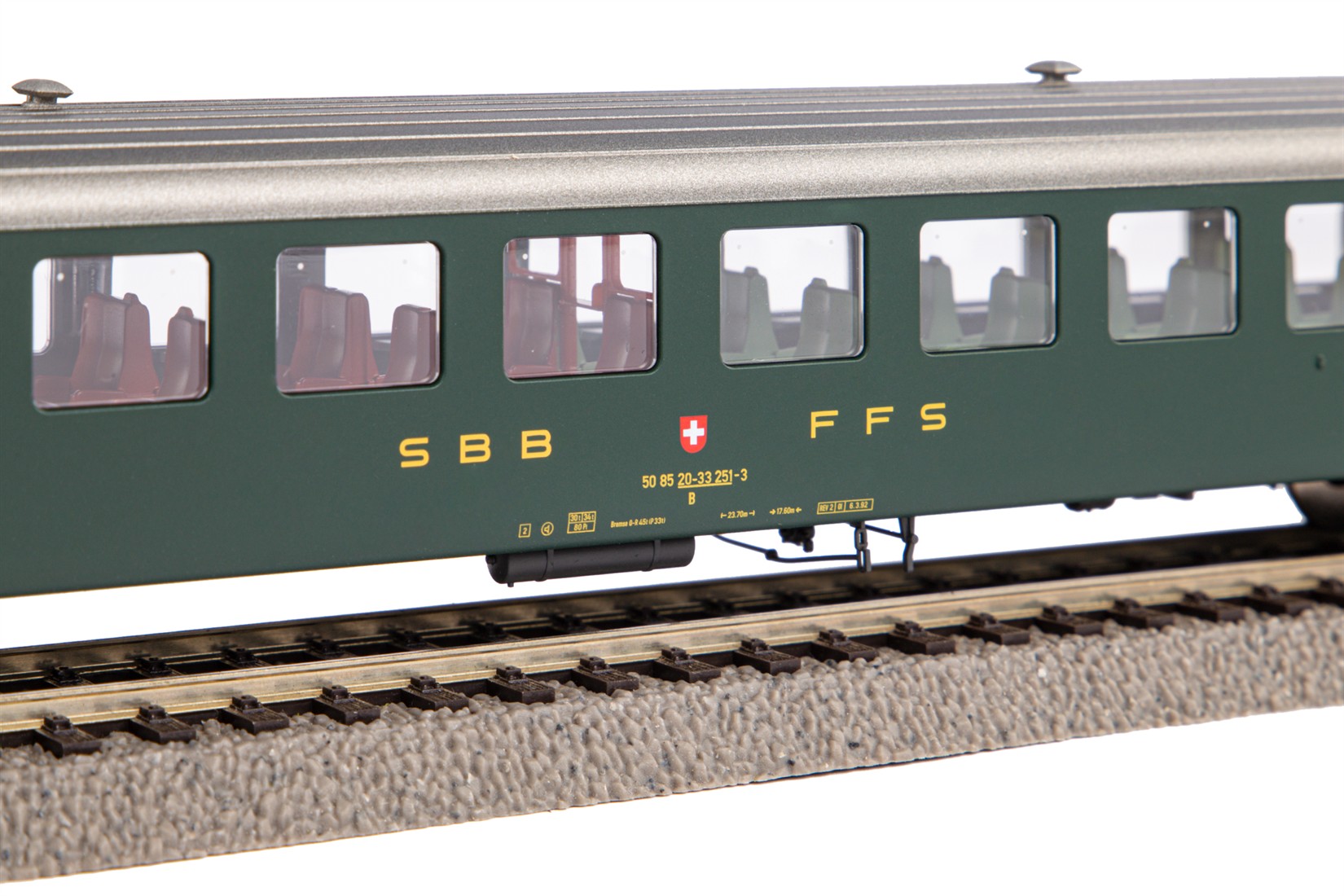 Druckvariante des Einheitswagens als 2. Klasse Wagen im Design der SBB in der Epoche IV mit alter Schrift.