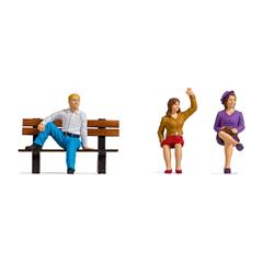 Das Figuren-Set beinhaltet 3 Figuren. Die Figuren haben alle einen sitzende Haltung und können auf der enthaltenen Bank platziert werden. Eine der Figuren hat ein Bein nach oben auf der Bank abgestützt. Die andere enthaltene Figur hat die Beine übereinander verschlagen. Die dritte enthaltene Figur hebt ihre Hand zum Gruß.