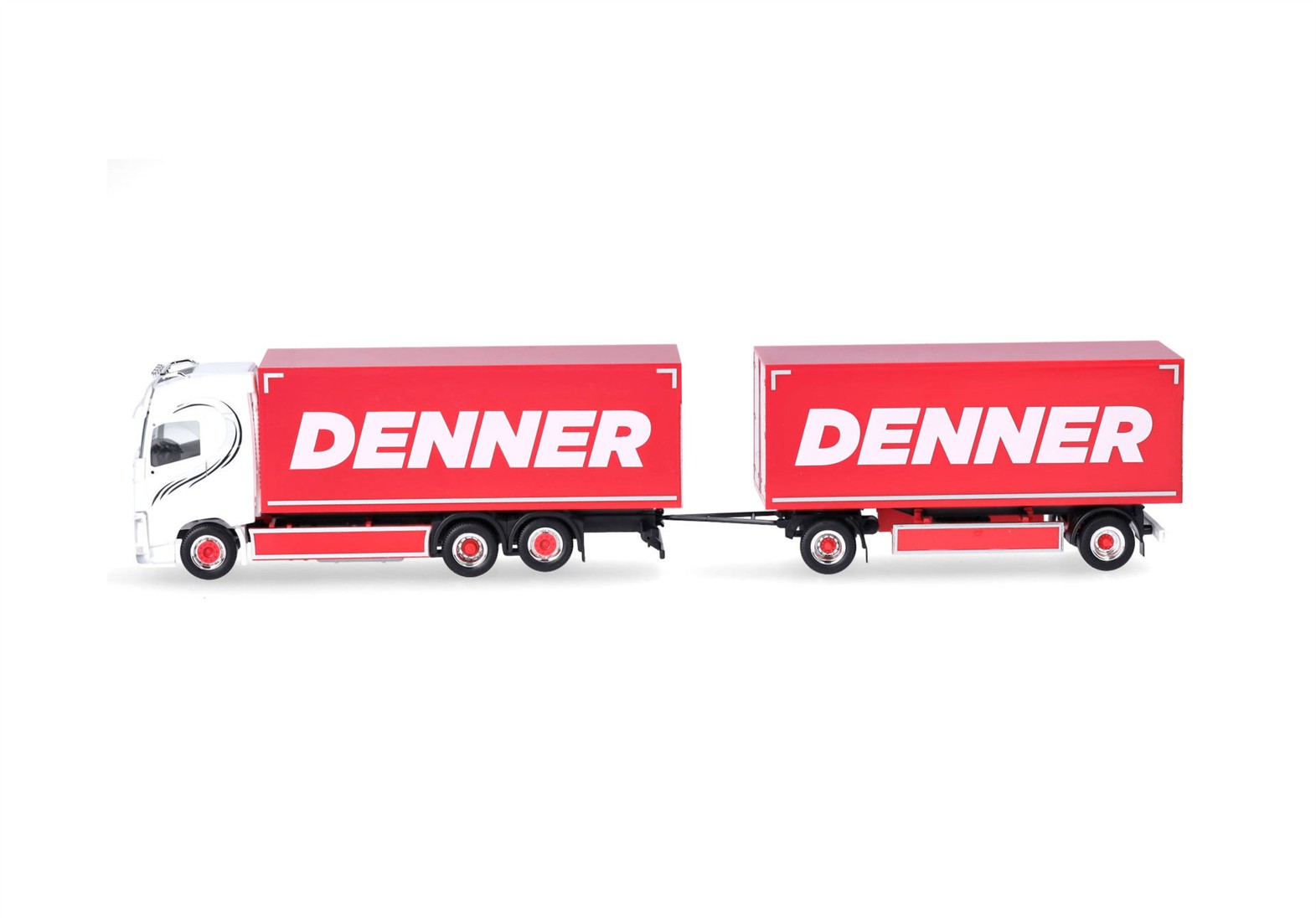 Sascha Berthold hat seine Spedition im schweizerischen Mitten, in Kanton Graubünden. Neben den LKWs mit Eigenwerbung fährt Sascha Berthold auch für den Schweizer Discounter Denner. Nach dem Sondermodell für den Schweizer Handel im Sommer (Art.Nr. 952415) erscheint nun dieser weiße Volvo als Hängerzug mit Festaufbauten. Wie in der Schweiz nicht unüblich ist der Koffer des Hängers mit Türen hinten und vorne bestückt, sodass ohne abzukuppeln durchgeladen werden kann. Das erspart dem Fahrer einige an Zeit beim Auf- und Abladen.