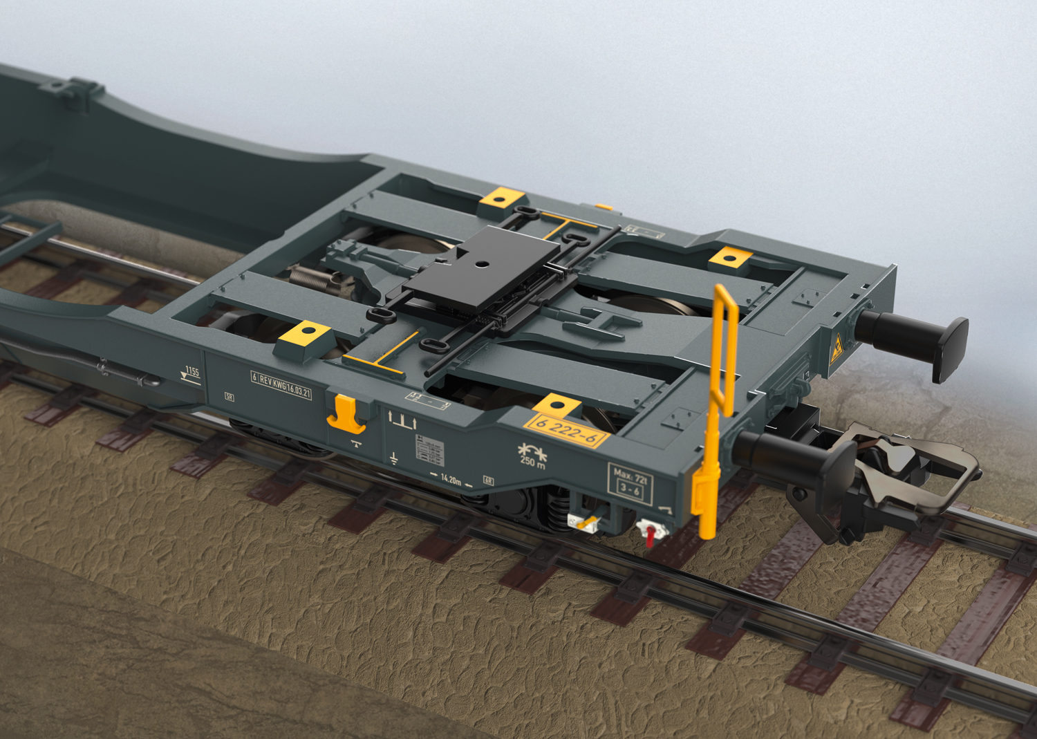 Beide Tragwagenhälften aus Metall, beweglich gelagert auf dem mittleren Drehgestell. Seitliche Klappriegel ab Werk montiert. Hochklappbar für den Transport von Containern oder Wechselbrücken. Viele separat angesetzte Details wie Übergangsrost, Tritte, Bremsleitungen und Haltestangen an den Wagenenden. Drehgestelle Bauart Y25. Pufferhöhe nach NEM. Aufnahme für Stützbock, Halterungen für Königszapfen in hoher und niedriger Ausführung, Rangiertritte und Luftkessel für die Wagenenden liegen als separat ansteckbare Teile bei. Beladen mit zwei Gardinenplanen-Sattelaufliegern der Spedition Mars. Länge über Puffer ca. 39,3 cm.