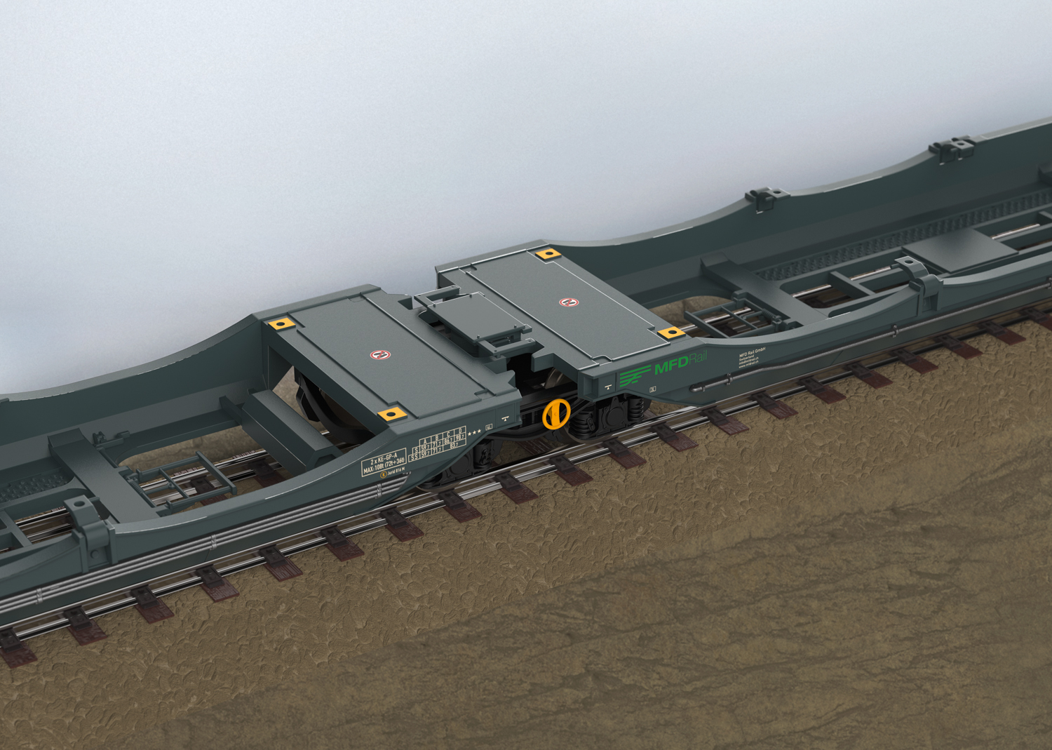 6-achsiger Doppel-Taschenwagen mit Gelenk der Bauart Sdggmrss mit geschwungenen Seitenflächen der MFD Rail GmbH.