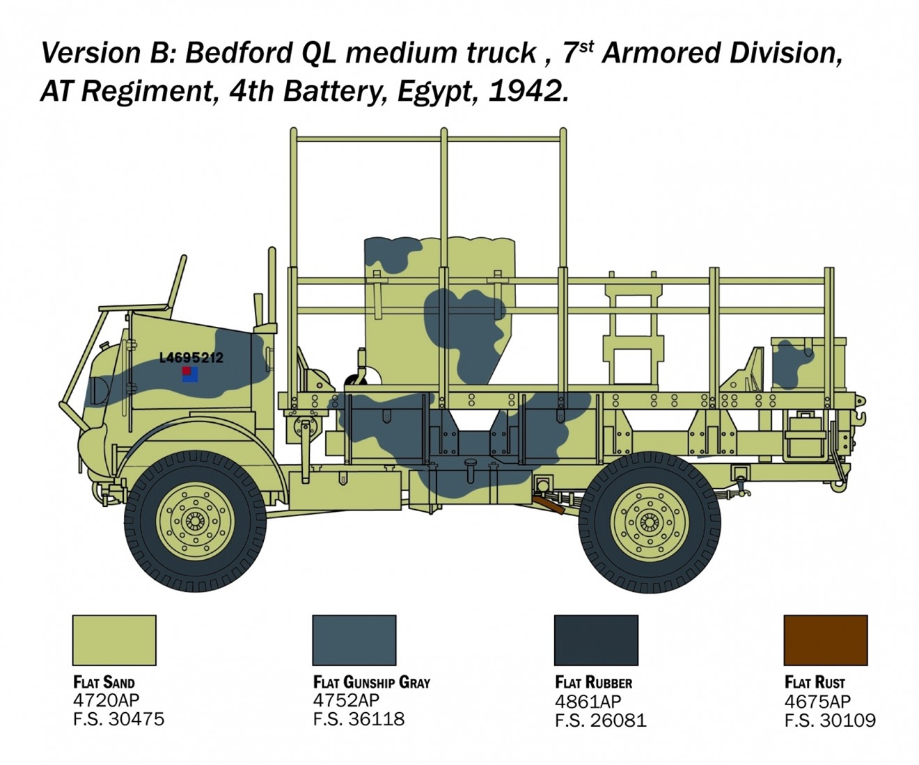 Die Baureihe der Militärlastwagen Bedford QL von wurde in den späten 1930er Jahren auf Wunsch der britischen Armee eingeführt, um ein moderneres und flexibleres Transportfahrzeug zu erhalten. Die Erprobung wurde 1940 abgeschlossen, und Anfang 1941 wurden die Bedford QLs an die operativen Abteilungen verteilt. Während des gesamten Krieges wurde er an den verschiedenen Fronten eingesetzt und erwies sich dank seines Allradantriebs und seines relativ geringen Gewichts, das seine Ladekapazität erhöhte, als wertvolle Unterstützung bei der Deckung des Logistik- und Transportbedarfs. Aufgrund seiner Flexibilität und Robustheit wurde er auch zum Schleppen und Transportieren von Artilleriegeschützen wie der 6 Pdr Panzerabwehrkanone oder der 40mm Bofors Flugabwehrkanone eingesetzt. Ausgestattet mit einem 72 PS starken 6-Zylinder-Benzinmotor, zeichnete er sich auch durch seine Wartungs- und Reparaturfreundlichkeit aus, ein wichtiges Element auf den Schlachtfeldern.