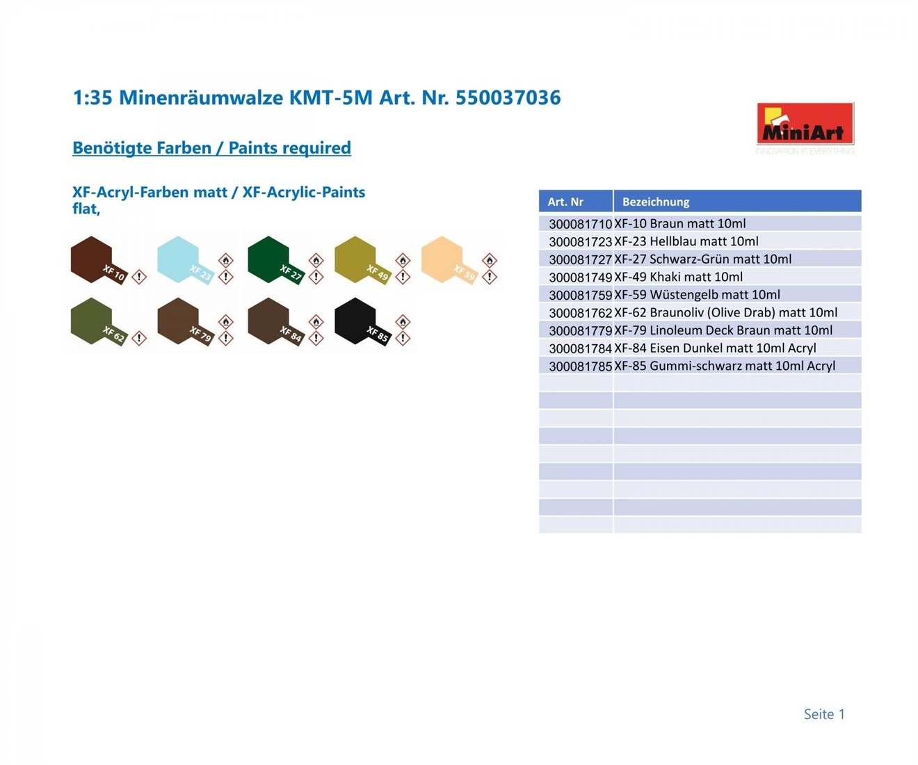 Das Standmodell ist eine Nachempfindung einer Minenräumwalze KMT-5M im Massstab 1:35. Mithilfe der originalgetreuen Nachbildung, wird die Detailtreue wiedergespiegelt, weshalb sich der Standmodellbausatz somit ideal für Dioramen mit entsprechenden Szenerien eignet.