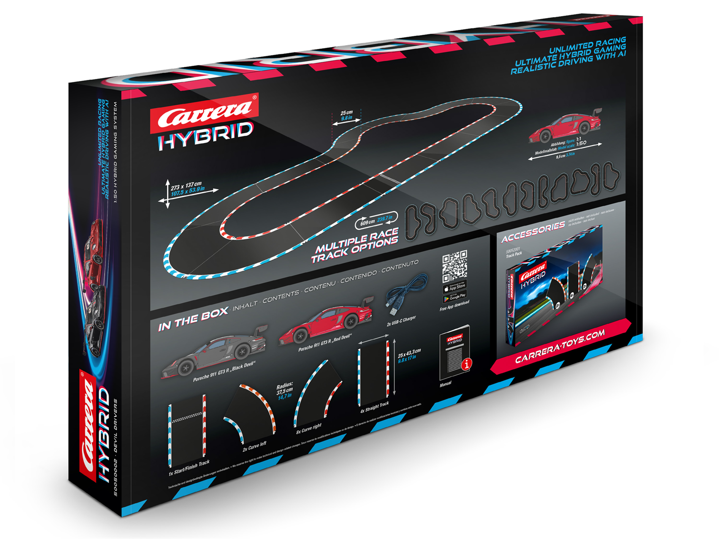 Das Carrera Hybrid - Devil Drivers Set erweckt die Rennbahn zum Leben. Mit einer beeindruckenden Länge von 6,09 Metern bietet die Strecke eine aufregende und abwechslungsreiche Rennerfahrung. Im Mittelpunkt dieses Sets stehen die exklusiven Modelle des Porsche 911 GT3 R "Black Devil" und "Red Devil", die in ihrer detaillierten Gestaltung und ihrem realitätsgetreuen Fahrverhalten bestechen. Dieses Set ist die perfekte Wahl für diejenigen, die eine lebensechte und interaktive Rennspiel-Erfahrung mit einer Prise Eleganz suchen.