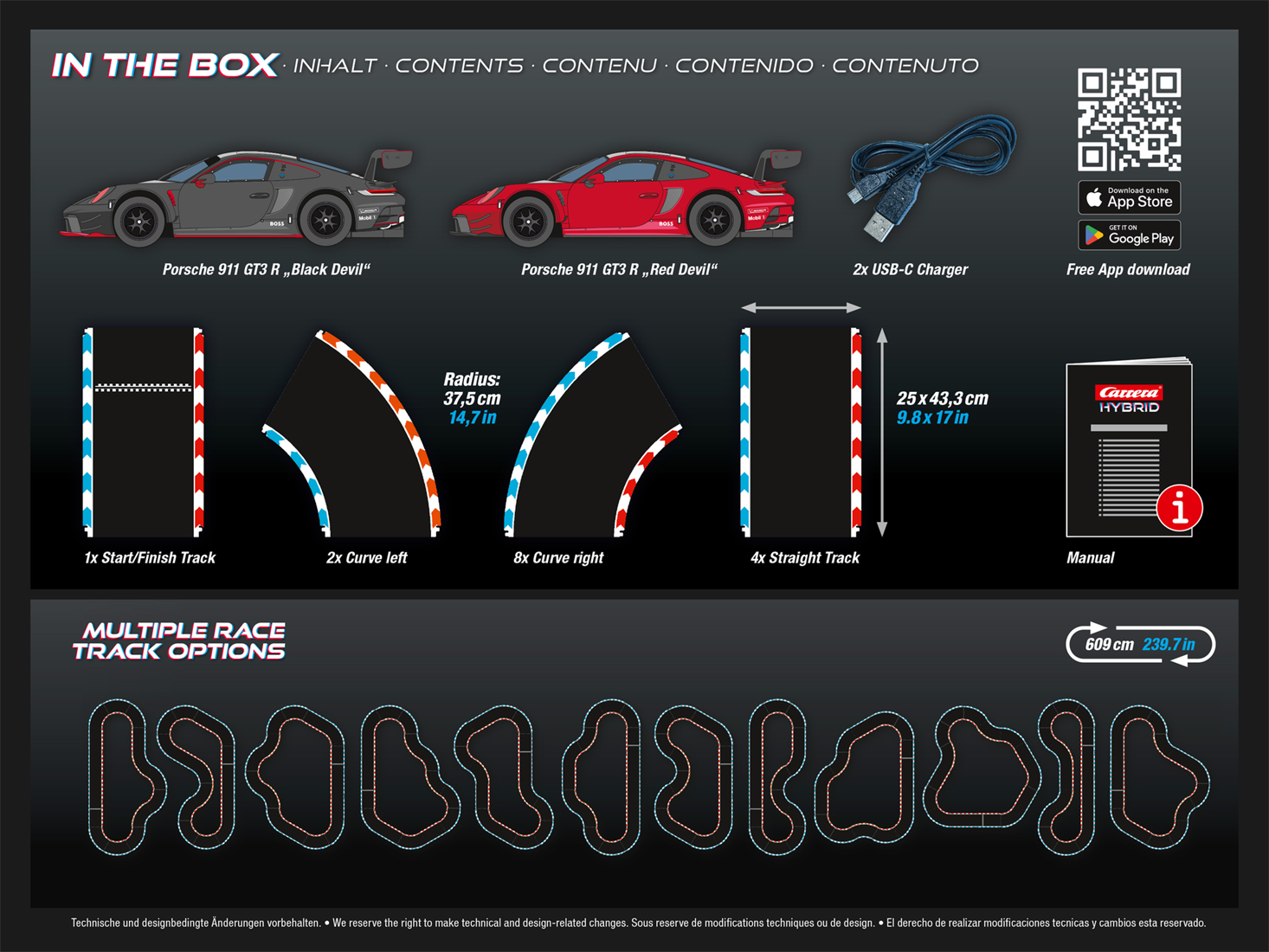 Das Carrera Hybrid - Devil Drivers Set bietet alles, was du für ein aufregendes Rennabenteuer benötigst. Neben den zwei detailgetreuen Porsche 911 GT3 R Modellen "Black Devil" und "Red Devil" enthält das Set eine vielseitig konfigurierbare Rennstrecke. Die Kombination aus einer Start-/Zielgeraden, vier geraden Abschnitten sowie acht Rechts- und zwei Linkskurven ermöglicht ein abwechslungsreiches und dynamisches Rennen. Die beiliegenden zwei USB-C-Ladekabel halten die Fahrzeuge rennbereit. Dieses Set vereint fortschrittliche Technologie mit dem puren Vergnügen des Rennsports.