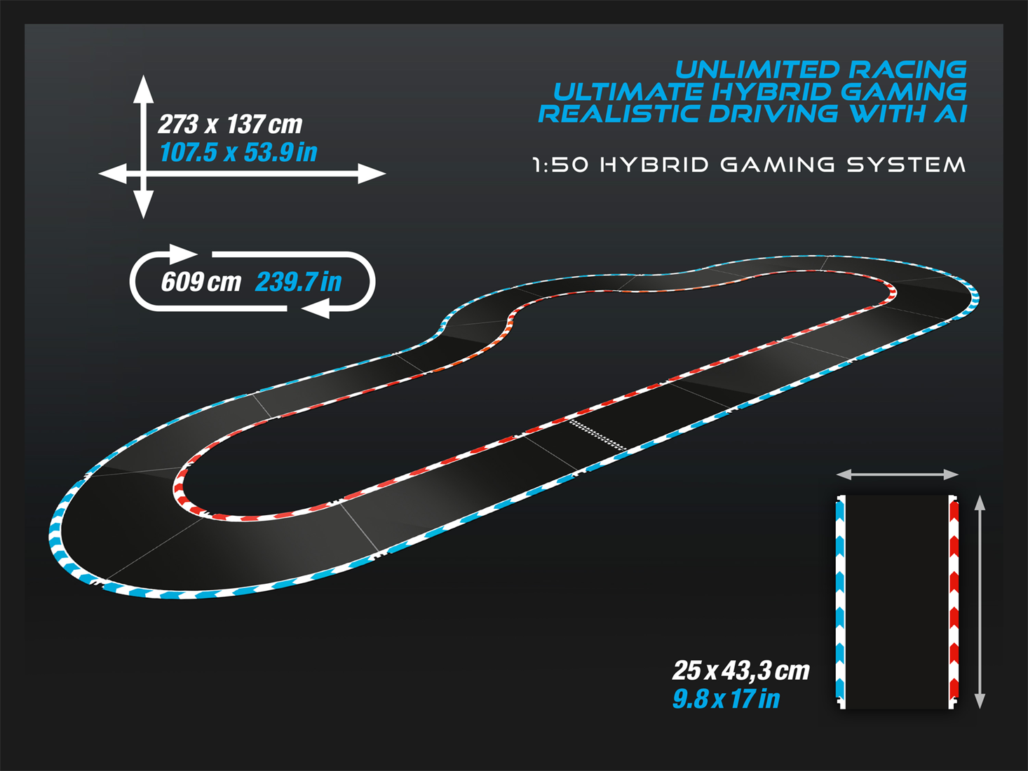 Die Rennstrecke des Carrera Hybrid - Devil Drivers Sets bietet mit ihrer Länge von 6,09 Metern vielfältige Möglichkeiten für ein realistisches Rennerlebnis. Auf einer Fläche von beispielsweise 268 cm x 136 cm aufgebaut, ermöglicht sie vielseitige und realistische Rennen. Die Kombinationsmöglichkeiten aus Geraden und Kurven bildet die ideale Grundlage für dynamische und spannende Rennen, bei denen sowohl Geschick als auch strategisches Denken gefordert sind. Diese Rennbahn ist mehr als nur ein Spielzeug – sie ist eine Arena für packende Rennabenteuer und taktisches Geschick!