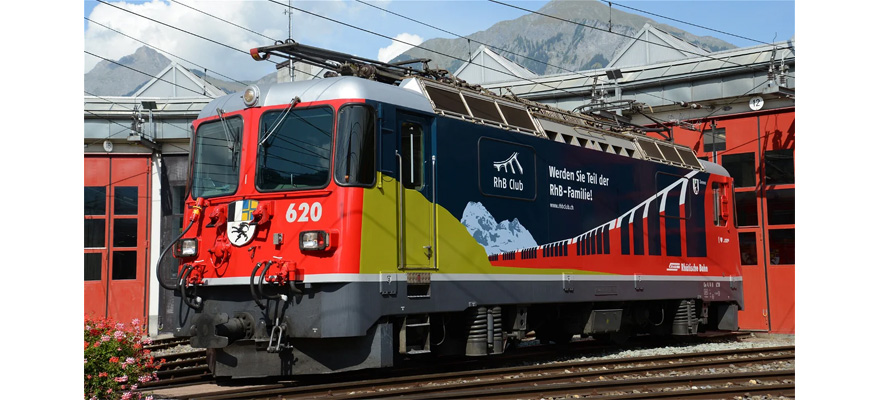 Ab 1993 beschaffte die Rhätische Bahn neun moderne Hochleistungs-Lokomotiven vom Typ Ge 4/4 III für den schweren Personen- und Güterverkehr auf den Gebirgsstrecken im Kanton Graubünden. Die erste Lok, Nr. 641 Maienfeld war auch die erste Werbelok auf dem RhB-Streckennetz. Kurz nach ihrer Fertigstellung wurde die Lok mit Werbung für den berühmten »Heidiland-BerninaExpress« beschriftet. Die große Schweizer Fahne und die Edelweiß-Blüte sind das Markenzeichen dieser charmanten Themenlok.