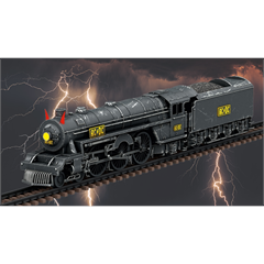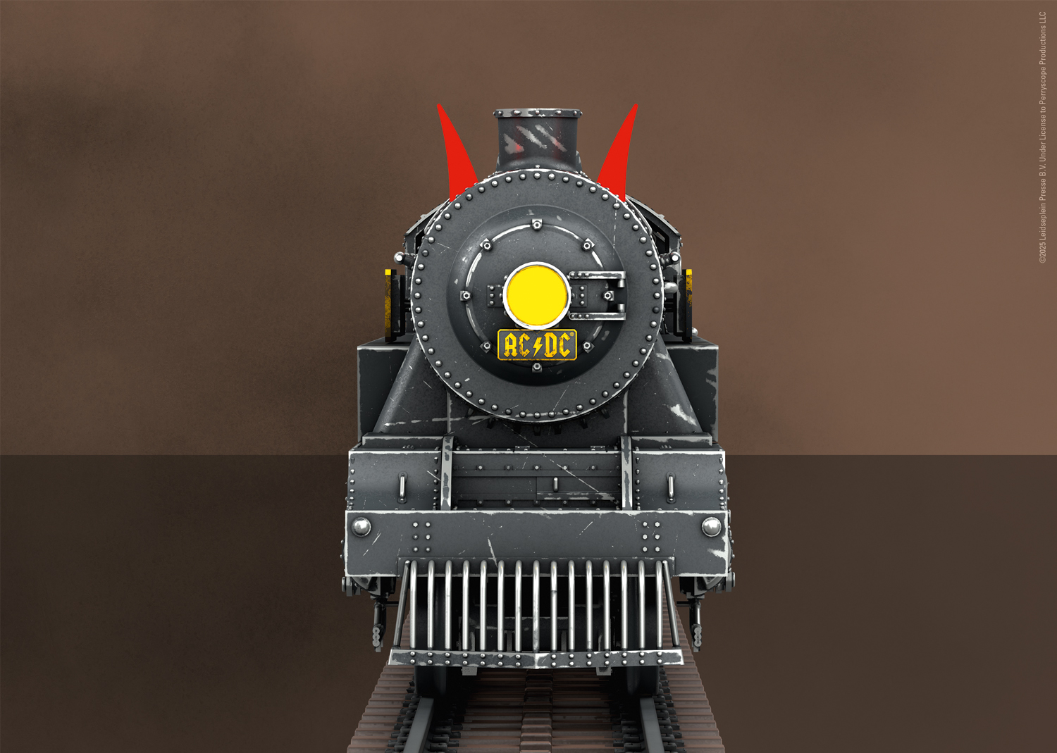 Mit Digital-Decoder mfx+ und umfangreichen Licht- und Soundfunktionen. Geregelter Hochleistungsantrieb mit Schwungmasse im Kessel. Drei Achsen angetrieben. Haftreifen. Lokomotive und Tender weitgehend aus Metall. Serienmäßig eingebauter Raucheinsatz, mit geschwindigkeitsabhängigem, dynamischem Rauchausstoß, digital schaltbar. Frontscheinwerfer mittig auf der Rauchkammertür der Lok und eine Lampe an der Tenderrückseite konventionell in Betrieb, digital schaltbar. Die Beleuchtung des Frontscheinwerfers kann auf rot umgeschaltet werden. Die AC/DC typischen Teufelshörner sind beleuchtet und können digital zugeschaltet werden. Führerstandsbeleuchtung und Feuerbüchsenflackern digital schaltbar. Beleuchtung des Tender-Durchgangs digital schaltbar. Beleuchtung mit wartungsfreien warmweißen und roten Leuchtdioden (LED). Verstellbare Kurzkupplung mit Kinematik zwischen Lok und Tender. Am Tender kinematikgeführte Kurzkupplung mit NEM-Schacht. Pufferhöhe an Lok und Tender nach NEM. Bremsschläuche, Schraubenkupplungsimitationen und geschlossene Zylinderdeckel liegen bei. Länge über Puffer ca. 24,5 cm.