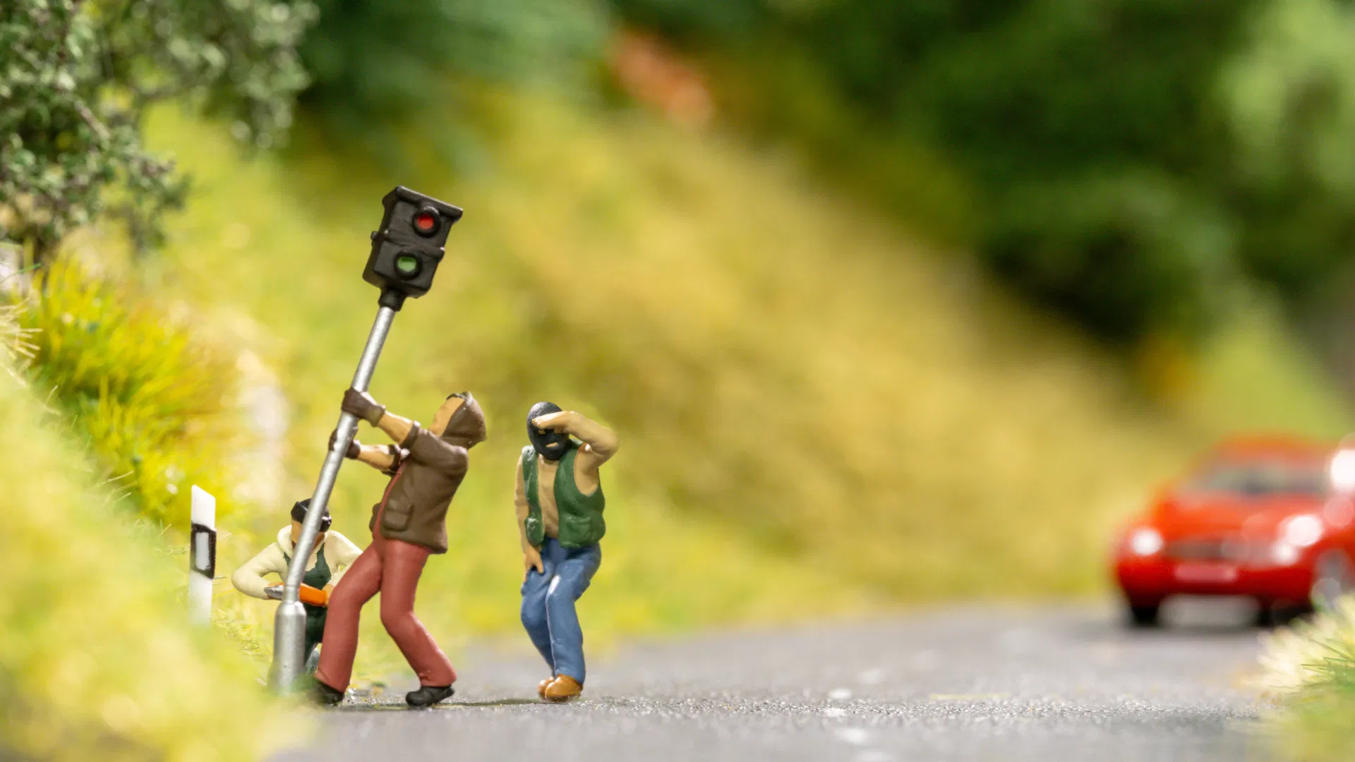 Mit Funny-Scenes “Zu schnell” bringt NOCH eine freche und spannende Szene für Ihre Modellwelt! Dieses Figurenset zeigt eine Gruppe dreister Gestalten bei einem ungewöhnlichen Unterfangen: Die drei Männer sind dabei, einen Blitzer auf kreative Weise außer Gefecht zu setzen! Einer kniet konzentriert am Boden, ein anderer hält die Stange des Blitzers fest, während der dritte Ausschau hält, um sicherzustellen, dass die Aktion unbeobachtet bleibt.