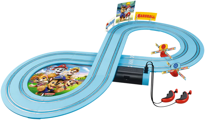 Die kleinsten Rennfahrer können jetzt mit den mutigen Hunden Chase und Marshall in ihrem neuen Abenteuer durchstarten. Die Carrera FIRST „PAW Patrol - On the Track“ Spielbahn bringt die Helden der PAW Patrol direkt ins Kinderzimmer. Auf der 2,4 Meter langen Strecke rasen Chase und Marshall mit ihren Einsatzfahrzeugen durch spannende Kurven, schnelle Geraden und knifflige Passagen. Ein witziger Kreisel bringt zusätzliche Action und lässt die Kinder hautnah miterleben, wie es sich anfühlt, selbst ein Teil der Rettungsmission zu sein. Bunte Deko-Elemente aus der PAW Patrol Serie schaffen eine authentische Atmosphäre und ziehen die kleinen Piloten direkt in das Abenteuer. Das Set ist batteriebetrieben, mit kindgerechten Handreglern ausgestattet und sorgt so für spielerischen Spaß.