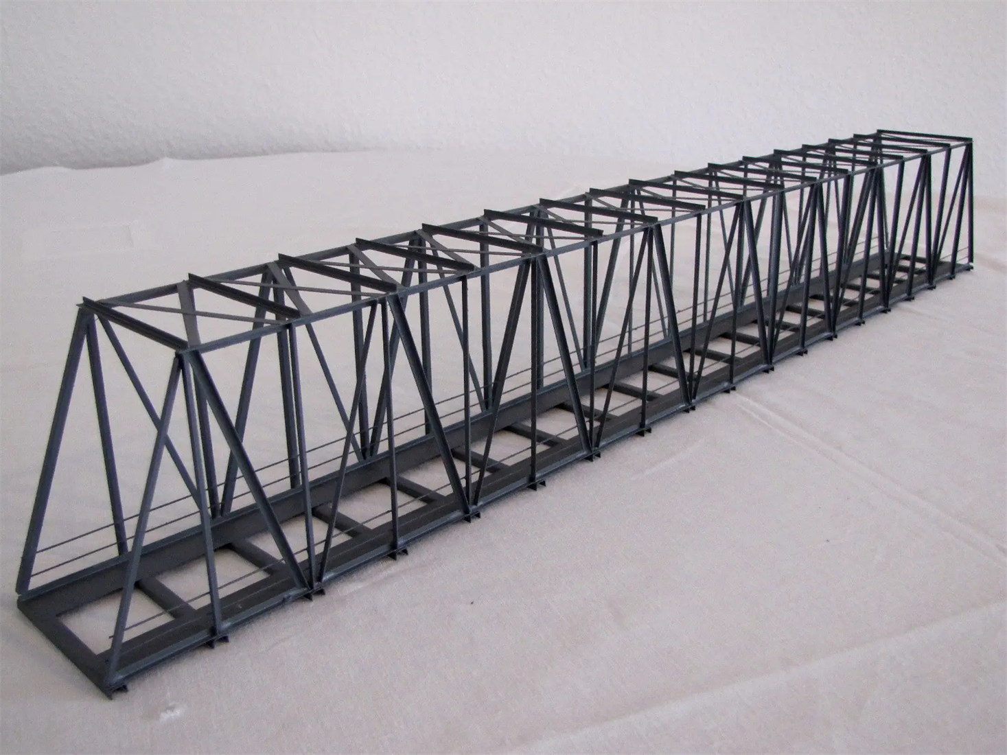 Lange Kastenbrücke schräg, 63 cm grau, feine Streben, eingleisig.