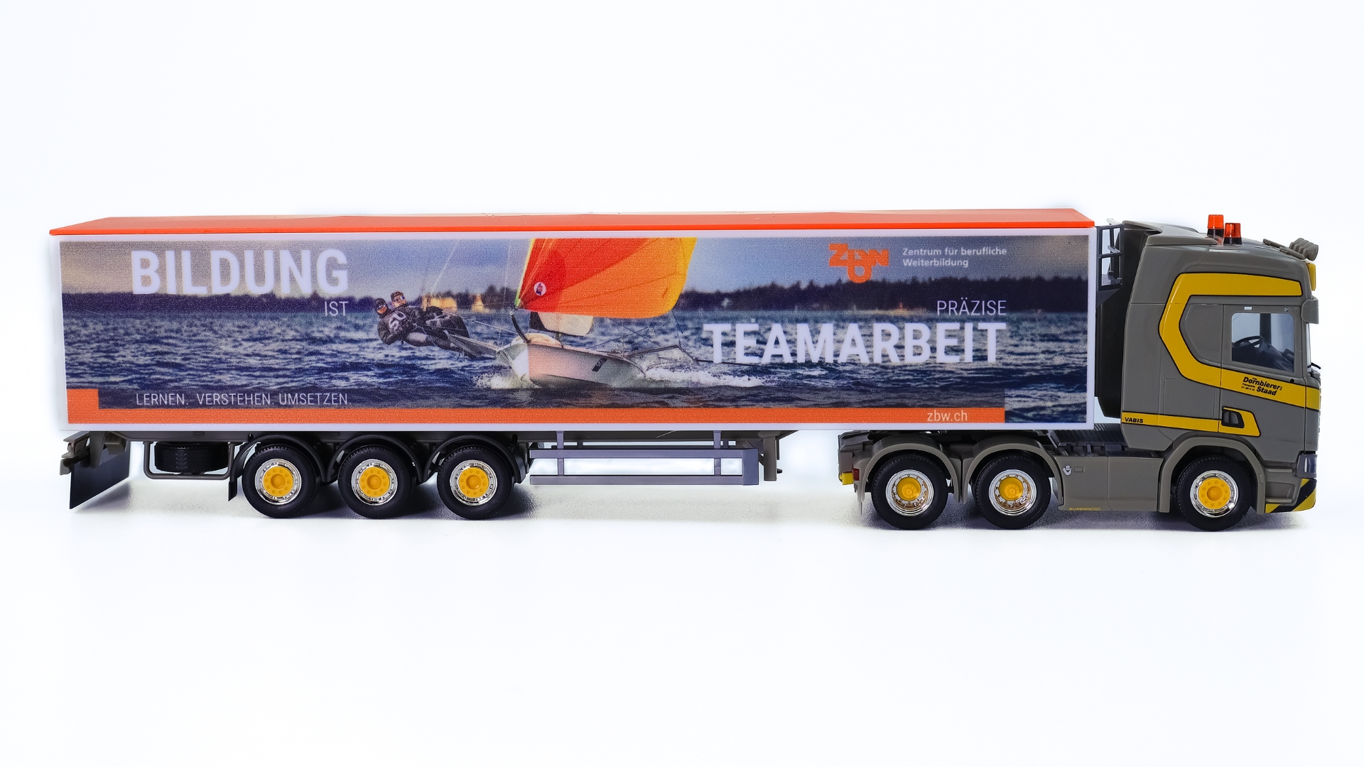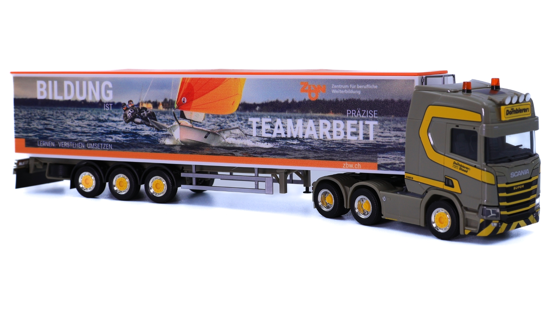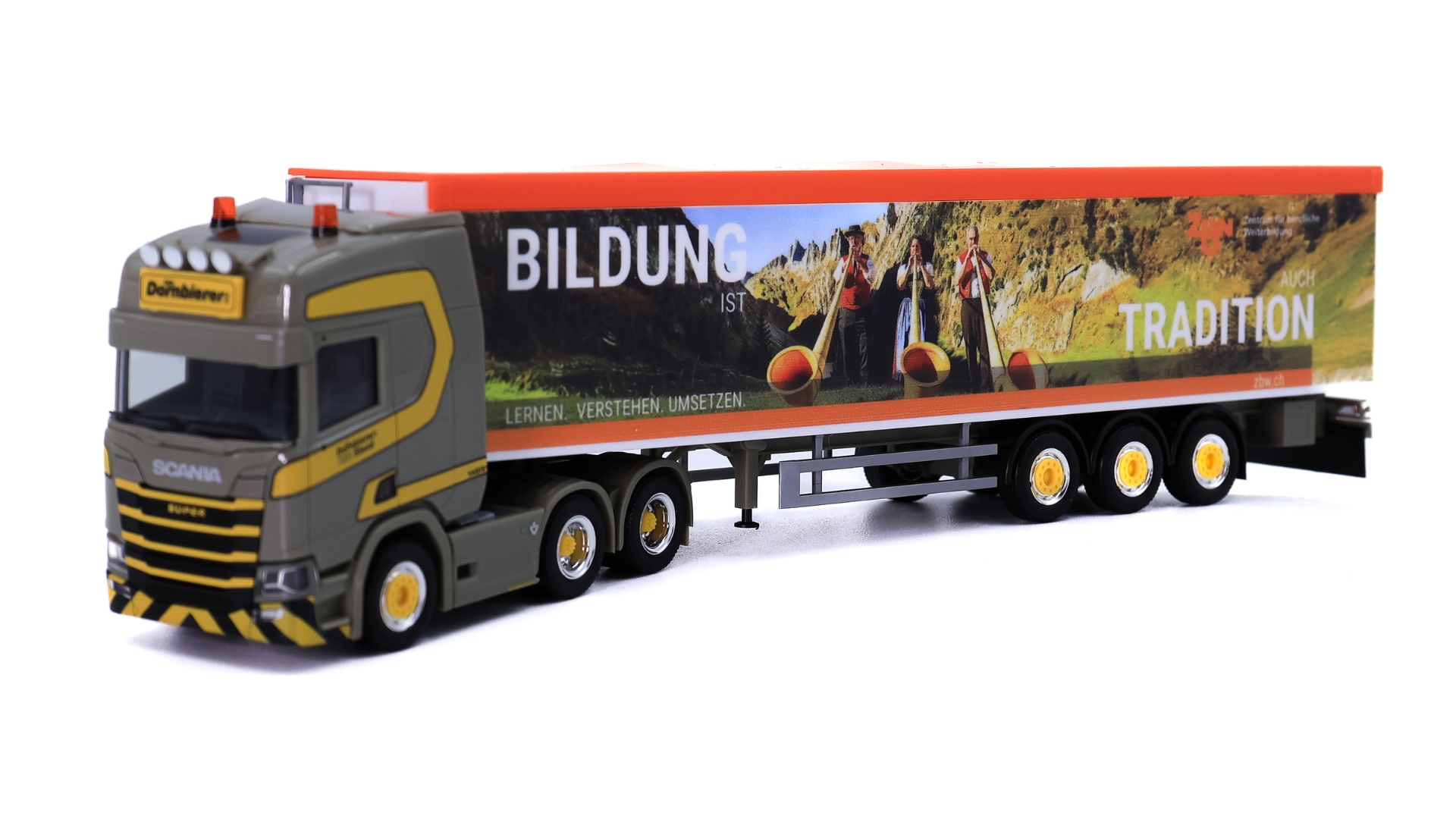 Scania CR 20 Hochdach Schubboden-Sattelzug, mit zbw.ch Werbung, "Dornbierer" (CH)