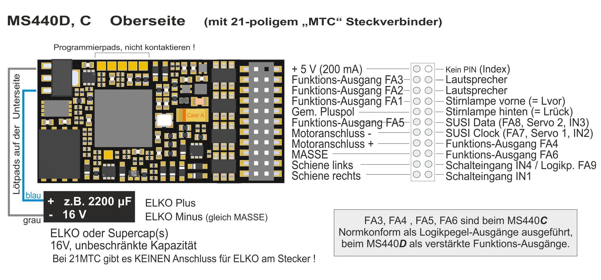 MS440 gibt es ausschließlich mit der 21MTC-Schnittstellle, allerdings in zwei Varianten (-D und -C), die sich durch die Auslegung der höheren Funktionsausgänge (FA3 bis FA6 als Open-Collector oder Logikpegel) unerscheiden, wobei die Varianten allerdings mittels CV-Programmierung ineiander umwandlbar sind (zur Selbst-Korrektur von Fehlbestellungen). 21MTC war eine Zeitlang (etwa in den Jahren 2000 bis 2010) die am weitesten verbreitete Schnittstelle, hat aber im Laufe der Zeit gegenüber PluX verloren, da sie tatsächlich weniger Funktionsausgänge bietet und es ein gewisses "Normen-Chaos" gibt; dies steht im Zusammenhang damit, dass sie urprünglich für elektronisch kommutierte Motoren konzipiert war ("C-Sinus"), die mittlerweile wieder aus der Modellbahnwelt verschwunden sind.