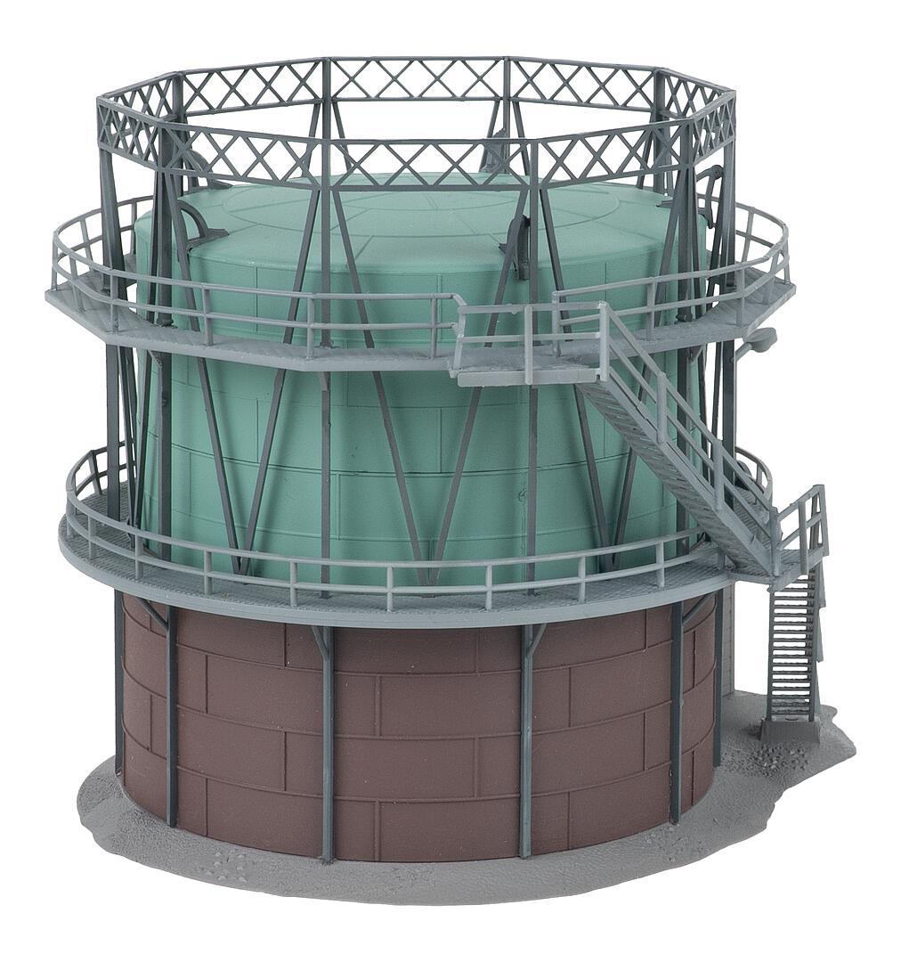 Mit seinem kompakten, aber markanten Erscheinungsbild fügt sich dieser kleine Stadtgaskessel perfekt in jedes Werks- oder Stadtmodell ein. Als Teil der historischen Energieversorgung verleiht der grün-braune Behälter der Anlage einen authentischen Hauch von Industriecharme.