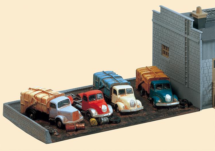 Die separat, lose angebaute Geländeplatte mit den Schrott-LKWs ist ein handkoloriertes Fertigmodell.