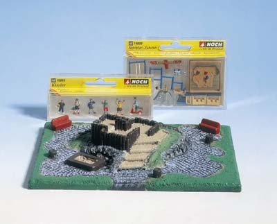 Die handkolorierte Platte aus Hartschaum stellt einen hübschen kleinen Spielplatz mit Spielburg, Sandkasten und Bänken dar. Mit den insgesamt zehn Teilen Spielplatzzubehör und den sechs spielenden Kindern zaubern Sie im Handumdrehen eine faszinierende kleine Szene in Ihre Modell-Landschaft