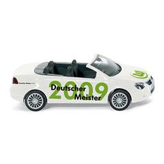 Seit der Juni-Auslieferung können sich WIKING-Freunde über den ungewöhnlichen VW Touareg in den Farben des Deutschen Fußballmeisters 2009 freuen. Doch die Erfolgsstory geht modellbauerisch weiter: Weil zum Gewinn der Deutschen Meisterschaft auch ein stattlicher Autokorso gehört, reagierte Volkswagen prompt und schickte bei herrlichem Sonnenschein einen candyweißen VW Eos durch die begeisterten Fanmassen. Sogar VW-Aufsichtsrat Ferdinand Piëch saß im Cabrio und rollte mit Torjäger Grafite und VW-Betriebsratschef Bernd Osterloh durch die Menschenmassen - nahezu 100.000 sahen zu. Ebenfalls im VW schrieben Trainer Felix Magath sowie Niedersachsens Ministerpräsident Christian Wulff Wolfsburger Fußballgeschichte. So legt WIKING in der August-Auslieferung noch einmal nach und stellt dem VW Touareg eine zweite Meister-Miniatur zur Seite.