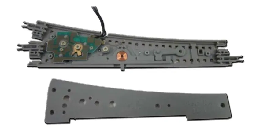 Das neue Rokuhan-Gleis ist formschön, robust, extrem stabil und leicht zu verlegen. Der Bettungskörper besteht aus einem elastischen Kunststoff, die Schienen sind aus Neusilber gefertigt. Die einzelnen Schienen lassen sich über spezielle Schienenverbinder leicht und sicher zusammenstecken. Die Schienenschuhe aus Metall werden dabei von Kunststoffclips auf der Schienenunterseite unterstützt, die mit einem hör- und spürbaren Klick einrasten. E-Weiche links R490-13° 110 mm + 1 Gleis gerade 110 mm, Bettung links angeschnitten.