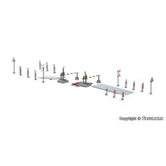 Bahnübergang mit 2 Bahnschranken, angetrieben durch 2 getrennte Unterflurantriebe. Die Schranken zeichnen sich durch langsames Öffnen und Schließen der Schrankenbäume aus. Gleisfüllstücke,