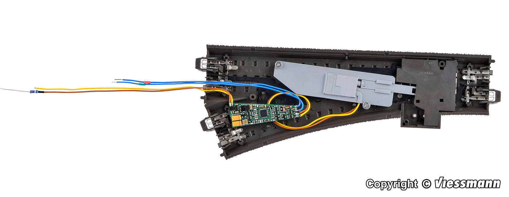 Der zugehörige Decoder versteht die Formate Märklin-Motorola und DCC und kann die angeforderte Soll- oder Ist-Stellung per RailCom an geeignete Digitalzentralen, z. B. Viessmann Commander Art. 5300/5320, zurückmelden. Er kann aber auch analog betrieben werden. Zusätzliche Schaltausgänge für Relais oder LEDs sowie für konventionelle Stellungsrückmeldung und Herzstückpolarisation vervollständigen den Funktionsumfang. Deren Funktion ist konfigurierbar.