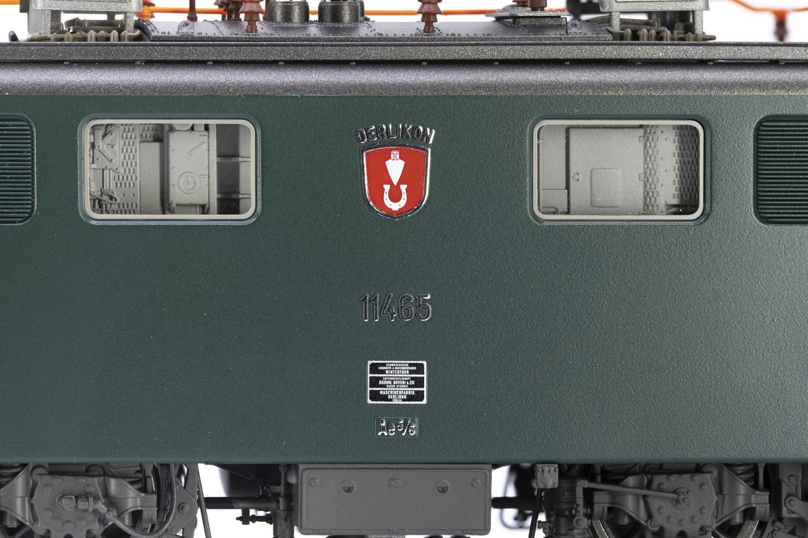 Das Modell der Ae 6/6 OERLIKON zeigt den Betriebszustand der 11465 nach der R2 aus dem Jahre 1999, also bereits mit Trittbrett und zusätzlichen Handgriffen, den neuen Scheibenwischeranlage und ohne Depotschild.