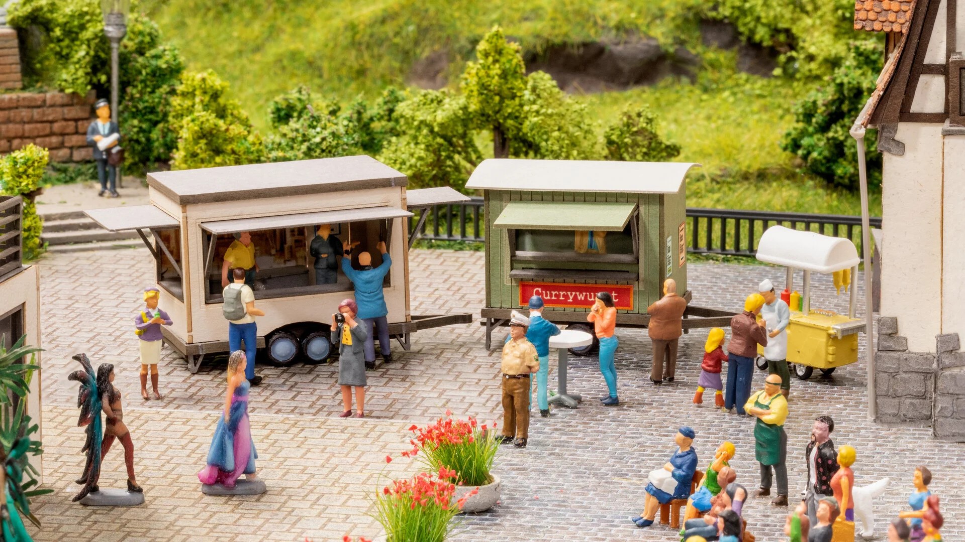 Bringen Sie alltägliche Szenen wie diese auch auf Ihre Modellanlage und sorgen Sie mit dem "Mobile Imbissstände" für einen echten Hingucker.
