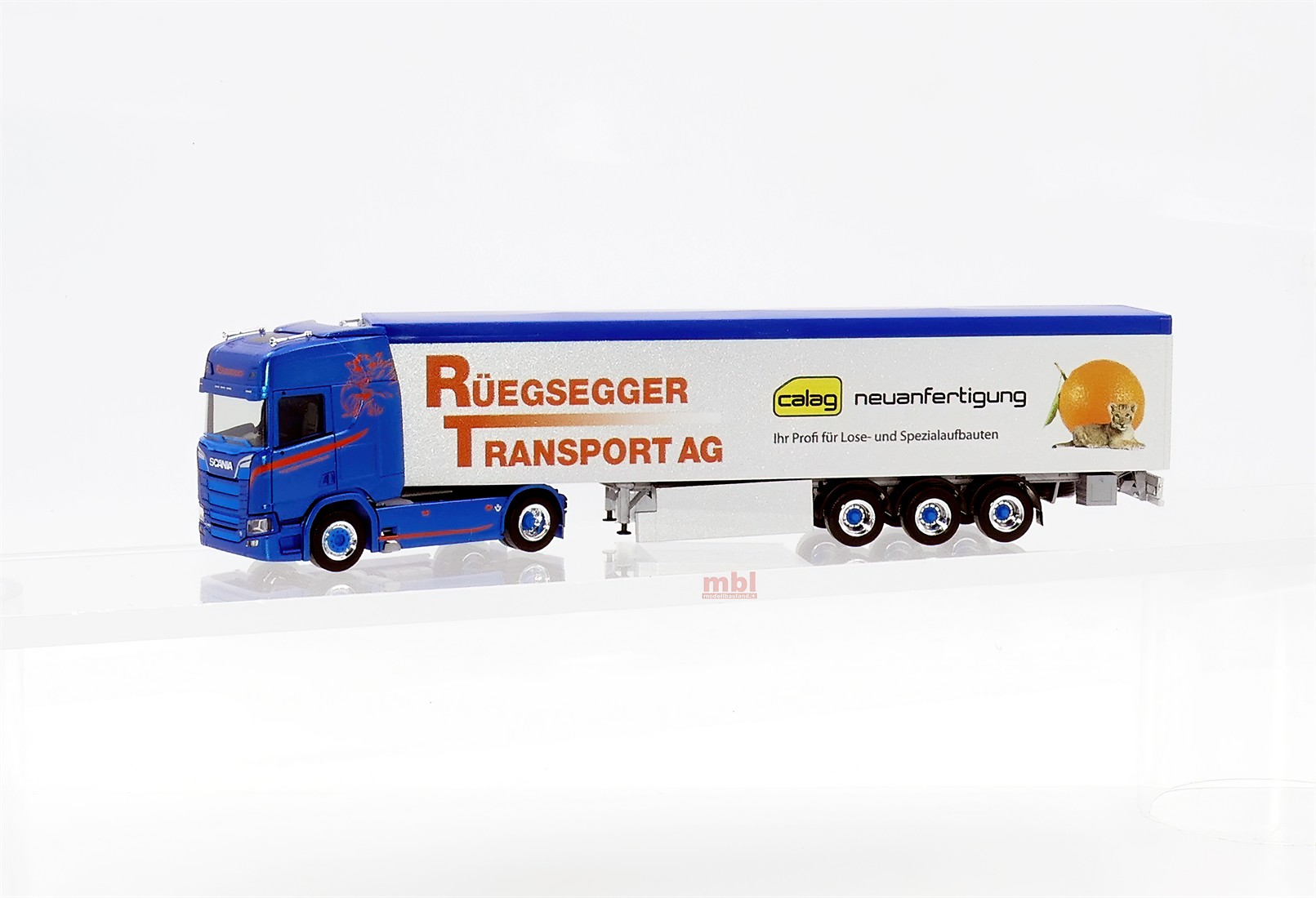 Herpa 952385 Scania CR Highline Schubboden-Sattelzug "Rüegsegger Transport AG" CH - H0