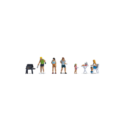Das Figurenset in der Spurweite H0 enthält sechs Personen sowie passendes Zubehör zum Thema Camping. Gemeinsam verbringen die zwei Familien einen entspannten Mittag auf dem Campingplatz. Hier darf das Grillen zu Mittag natürlich nicht fehlen. Ein Papa steht mit Grillzange am Grill, während seine hungrige Tochter daneben steht und wartet, bis das Essen endlich fertig ist. Eine Frau bringt die Teller zum Tisch, wo die andere Mutter bereits Platz genommen hat und das Geschirr herrichtet. Trinkflaschen sowie Becher und weitere Utensilien befinden sich bereits auf dem Tisch. Ein Papa trägt seinen glücklichen Sohn auf dem Rücken und hält weitere Teller in der Hand. Hier steht einem sonnigen und fröhlichen Tag nichts mehr im Wege.