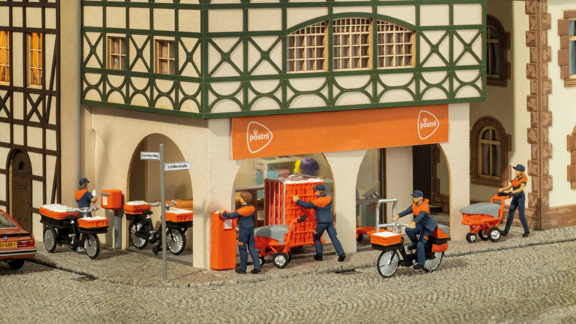 1 Briefträger, 3 Paketzusteller, 1 Postbote auf Fahrrad, 1 Postkisten-Wagen, 2 Zustell-Karren, 1 Fahrrad, 1 Lastenrad, 1 Transport-Rollwagen, 2 verschiedene Briefkästen