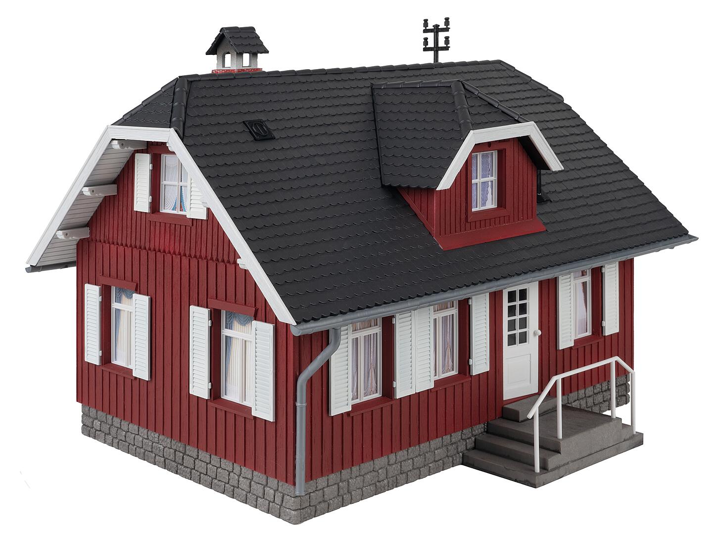 Traditionelles Modell eines Ferienhauses in schwedenroter Holzverkleidung und einem dunkelgrauen, ziegelgedeckten Walmdach mit zwei Dachgauben. Auf der Vorder- und Rückseite des Gebäudes führt eine Außentreppe mit Geländer zum Innenbereich. Die Türen sind beweglich.