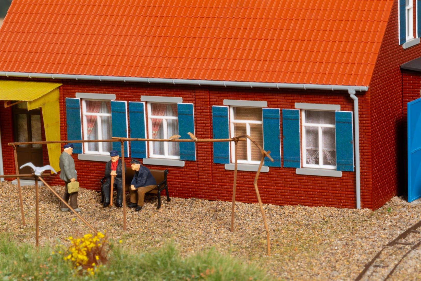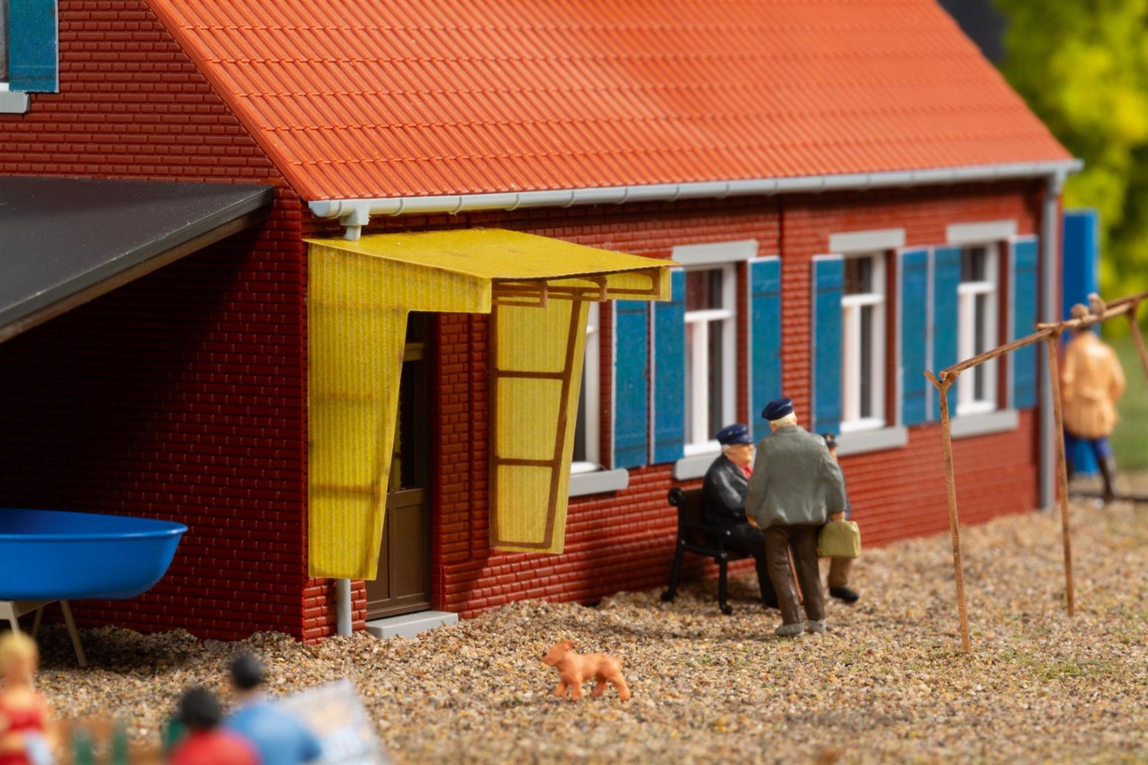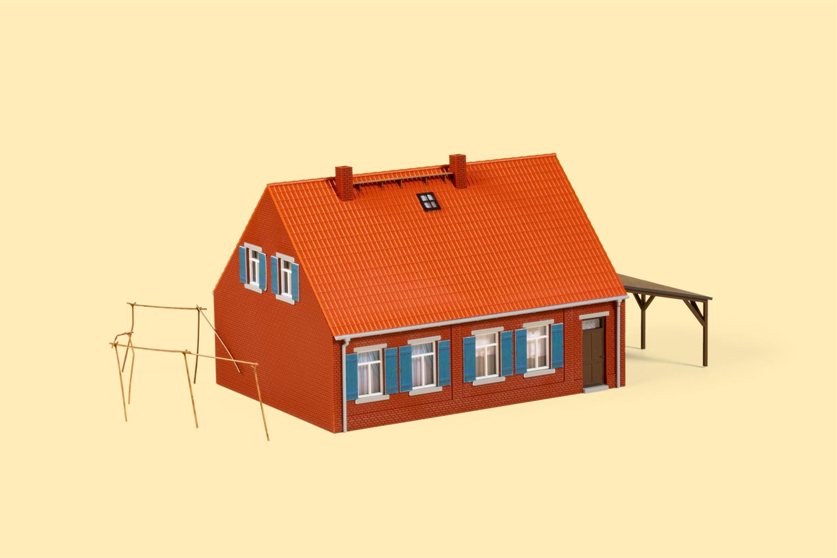 Einstöckiges Wohngebäude aus maßstabsgerechtem Klinkermauerwerk sowie fein graviertem Satteldach nach Norddeutschem Vorbild. Das Wetterschutzdach vor der Eingangstür und die Fensterläden verleihen dem Modell den typischen Charme. Ein beliebig positionierbarer Anbau bietet sich als Unterstand für diverse Gerätschaften an. Thematisch besonders gut zu Artikel 11 475 Hofladen und 11 476 Bootshaus mit Slipanlage passend.