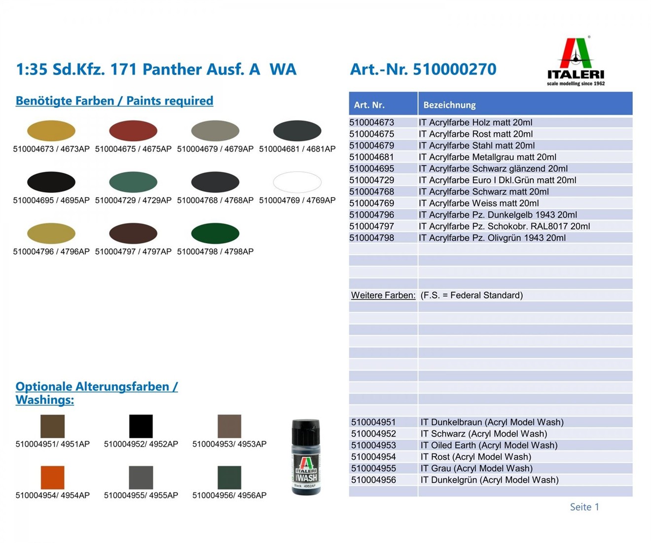 F Panzer Olivgrün 1943 4798AP | F.S. 34128 F Stk. Schokobraun RAL 8017 4797AP | F.S. 30045 F Rost 4675AP | F.S. 30109 MF Stahl 4679AP | F.S. 37178 F Weiß 4769AP | F.S. 37875 F Holz 4673AP | F.S.