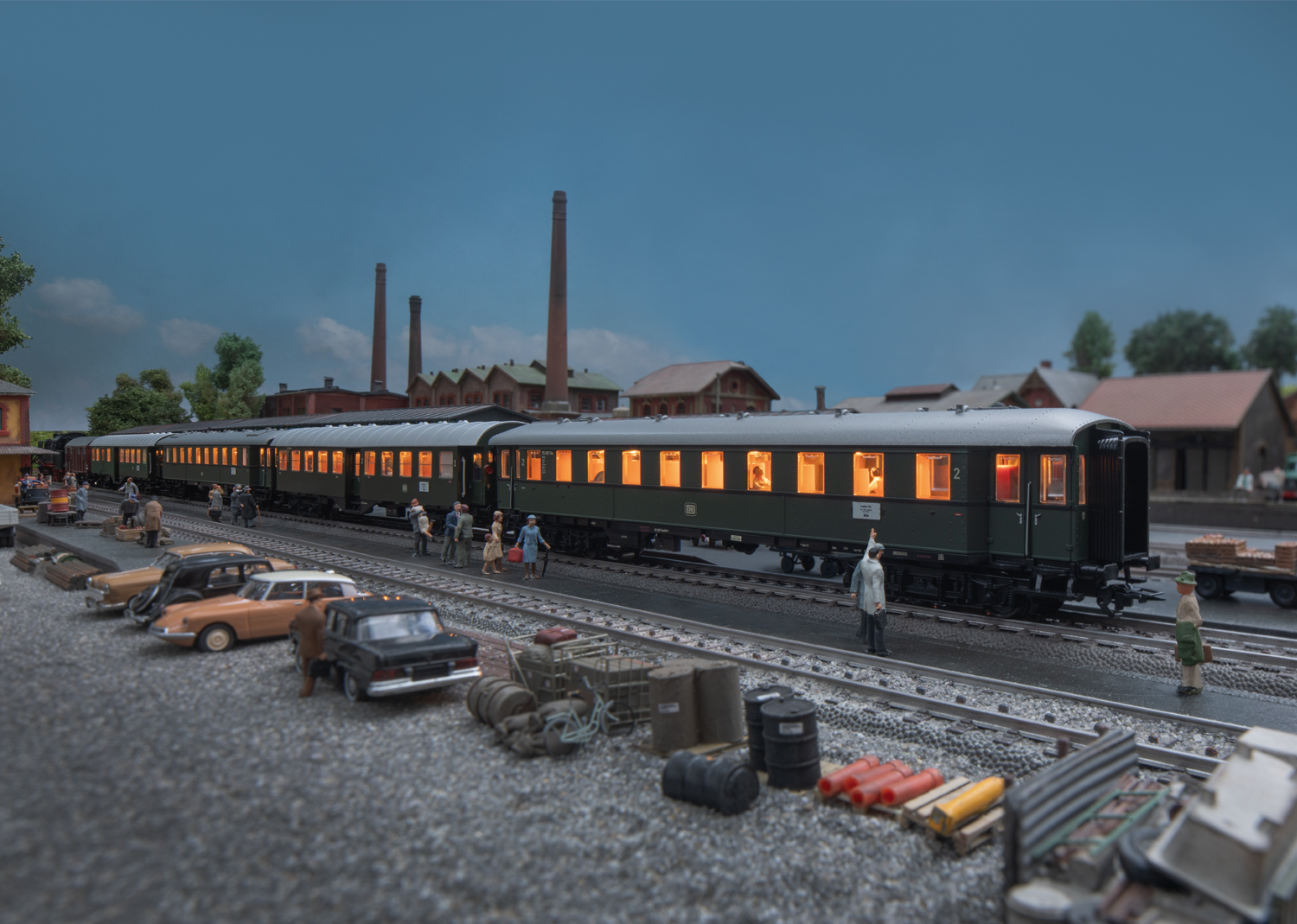 Jeder Reisezugwagen Wagen mit serienmäßig eingebauter LED Innenbeleuchtung, Pufferspeicher und trennbaren, stromführenden Kupplungen. An einem Wagen ist ein Schleifer montiert. Sitzwagen mit insgesamt 20 Miniatur-Figuren der Fa. Preiser bestückt. Gesamtlänge über Puffer ca. 103 cm.